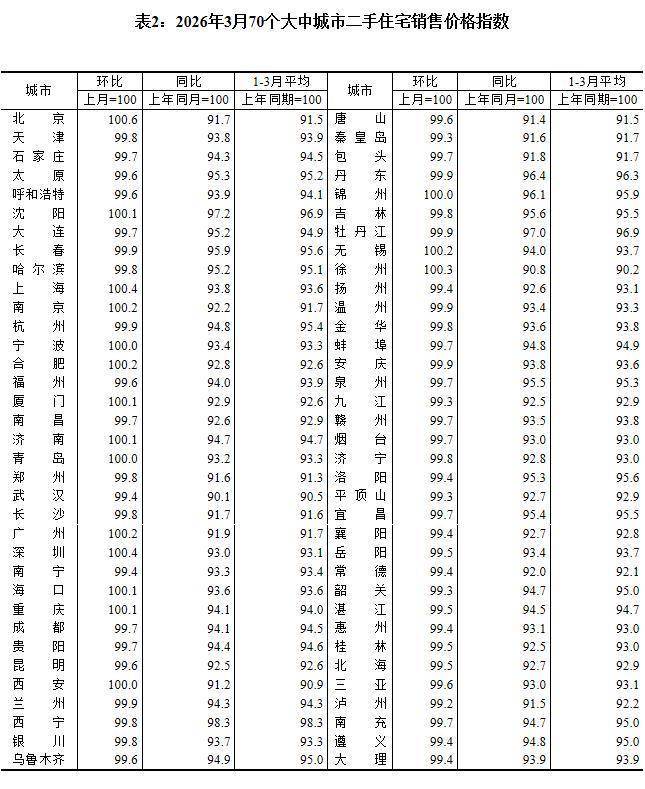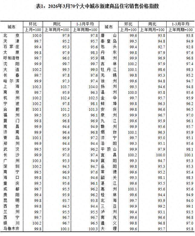 国家统计局4月16日公布数据显示,2026年3月份,70个大中城市中,一线城市商品住宅销售价格环比上涨,二三线城市环比降幅收窄或相同。新建商品住宅和二手住宅销售价格环比上涨城市个数均比上月增加。